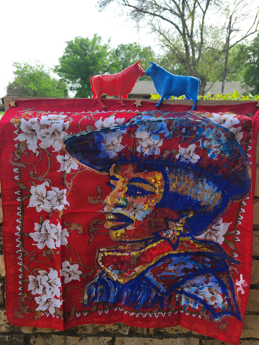 24 x 24 inch bandana with fabric paint and miniature cows on wood hanging bar with wooden stars.